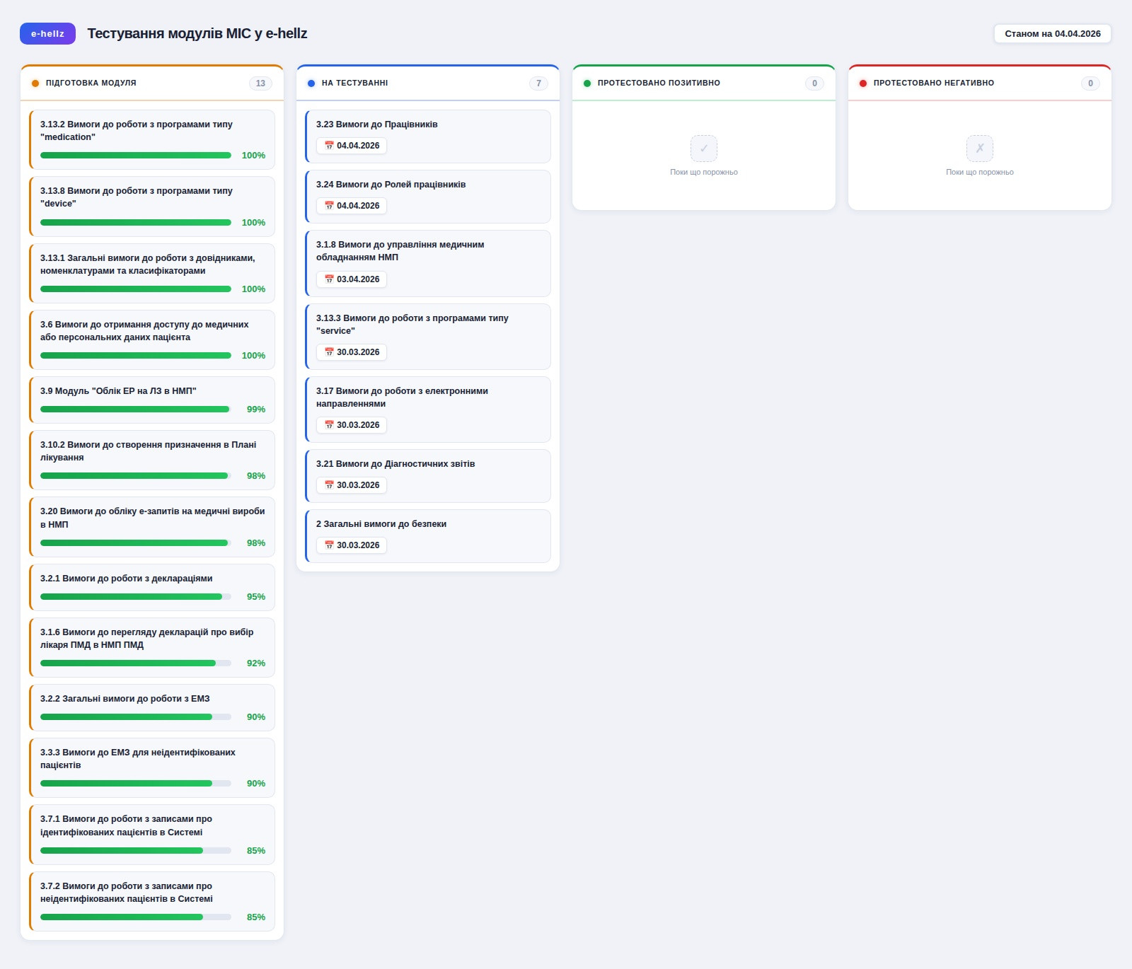 - Відправили в e-hellz для тестування дві заявки на два модулі. Загальний прогрес - див. на дашборді.