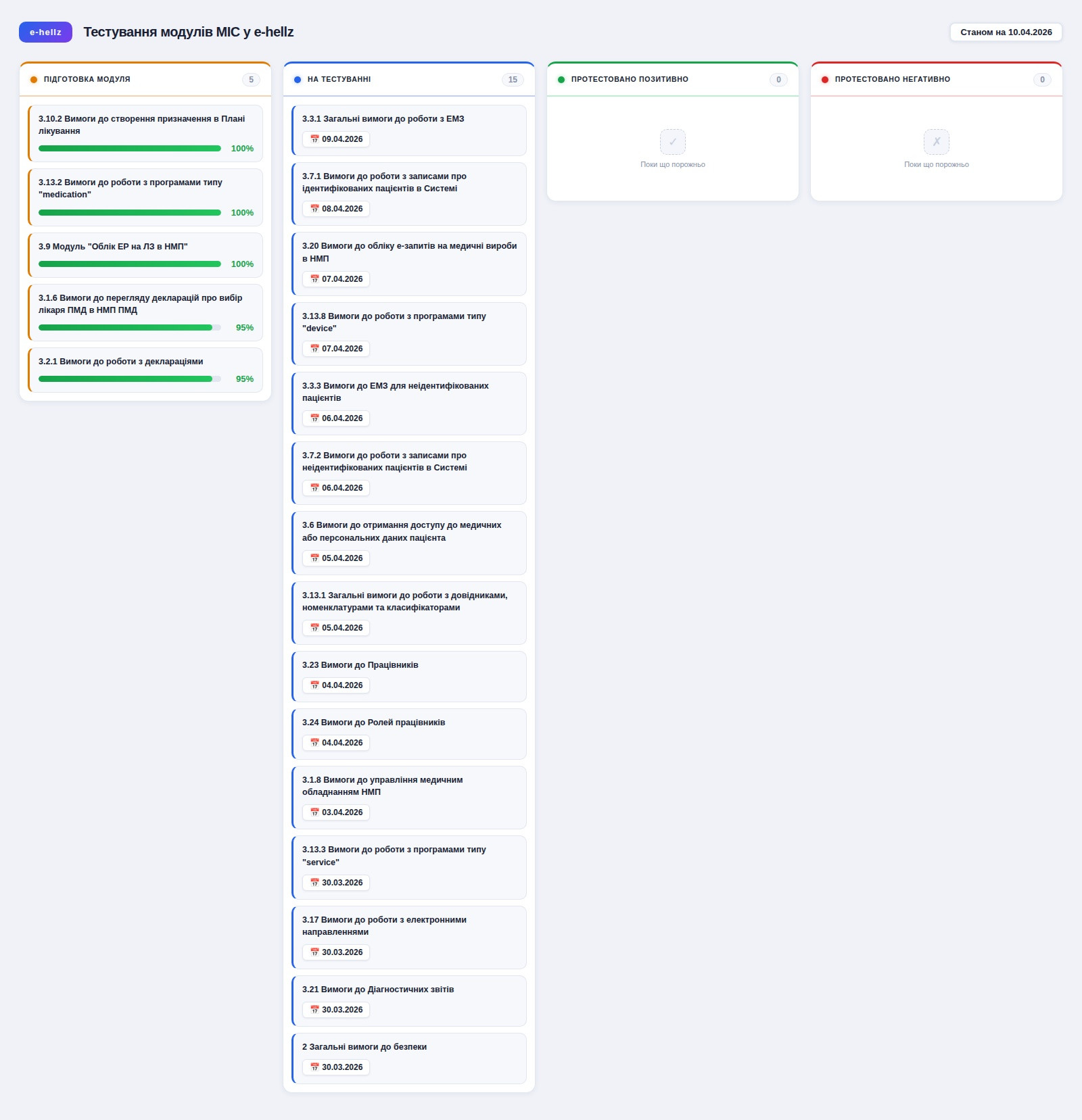 - Відправили в e-hellz для тестування одну заявку на один модуль.
