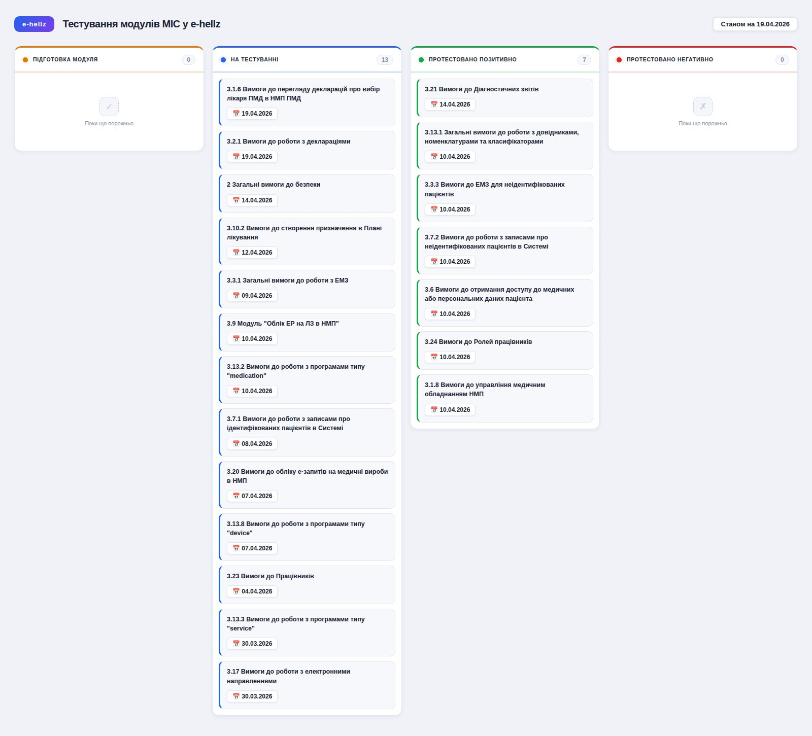 - Тестування безпеки зачіпає абсолютно всі інші модулі, тому нам довелося подати заявки на перетестування 7 модулів, які до цього вже отримали позитивний висновок. Тобто, з функціональної точки зору, ці модулі пройшли тестування на відповідність вимогам. Але формально їх тепер потрібно перетестувати разом з безпековими вимогами, бо тестувати безпеку у відриві від конкретних модулів e-hellz не вміє. Оскільки канбан показує стан функціональної відповідності модулів технічним вимогам, то для цих 7 модулів положення у канбані не змінилося.