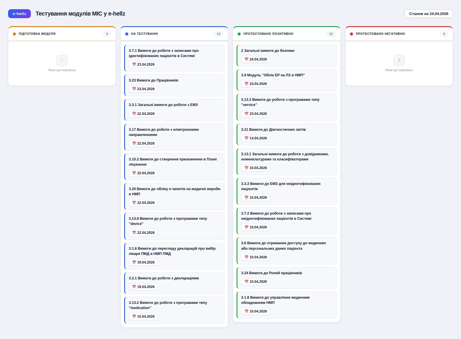 • Тестування безпеки зачіпає абсолютно всі інші модулі, тому нам довелося подати заявки на перетестування 7 модулів, які до цього вже отримали позитивний висновок. Тобто, з функціональної точки зору, ці модулі пройшли тестування на відповідність вимогам. Але формально їх тепер потрібно перетестувати разом з безпековими вимогами, бо тестувати безпеку у відриві від конкретних модулів e-hellz не вміє. Оскільки канбан показує стан функціональної відповідності модулів технічним вимогам, то для цих 7 модулів положення у канбані не змінилося.