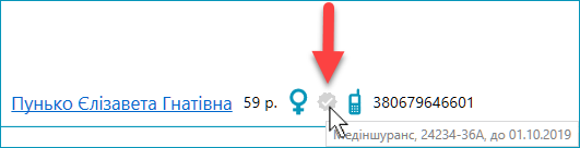 Якщо у пацієнта за останні три роки був хоча б один поліс страхування, але його дія вже закінчилася, то у рядку із ПІБ пацієнта буде відображатися сіра "блямба". Якщо навести на неї мишку, то з'явиться інформація про старий поліс. Вона також буде написана світло-сірим шрифтом: